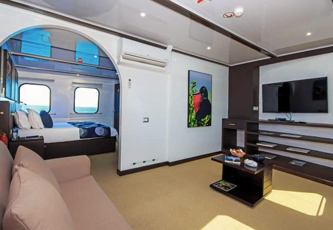 After a day of exploring the Galapagos’ unique environment, relax with a cocktail from the bar in the main deck sitting area, or upon the spacious sundeck which has chaise lounges and a Jacuzzi, as well as an alfresco dining area. If you have one of the four upper deck double cabins, you will enjoy a private balcony from where to watch the moonlight slither across the waves. Other double cabins are on the main and lower decks, while a well-appointed suite is on the main deck.