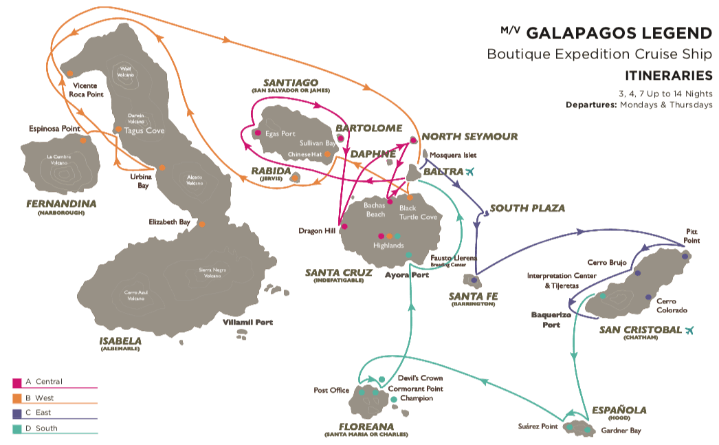 Designed specifically for cruising the Galápagos Islands, the Galápagos Legend offers all the amenities of a larger cruise liner yet still has the intimate feel of family-style cruising.